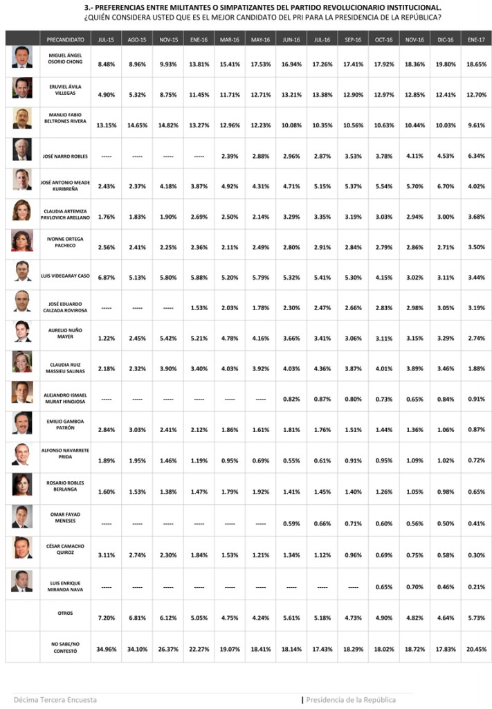 En segundo lugar se ubica el todavía gobernador del estado de México, Eruviel Ávila, con 12.70% y en el tercer puesto aparece el que fuera líder nacional de ese partido, Manlio Fabio Beltrones, con 9.61%.
