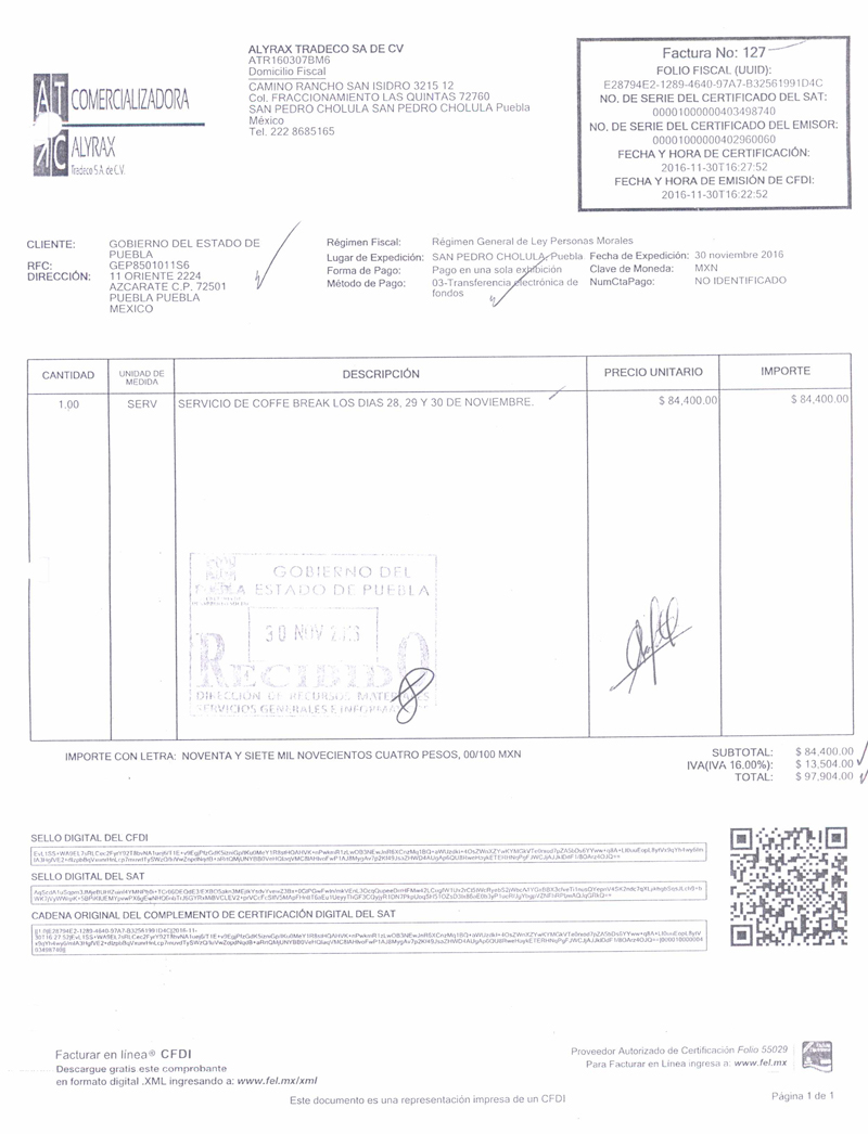 Para estos servicios la Sedeso firmó dos contratos: a Karla Belén Velázquez Coliote se le pagaron 114 mil 811 pesos por el servicio de los días 23, 24 y 25 de noviembre para “reuniones del FONDEN dependencias estatales, enlaces municipales y comunicaciones”, mientras que a Comercializadora Alyrax se dieron 97 mil 904 pesos por el coffee break para “reuniones de trabajo con delegados regidores y empresarios” los días 28, 29 y 30 de noviembre.