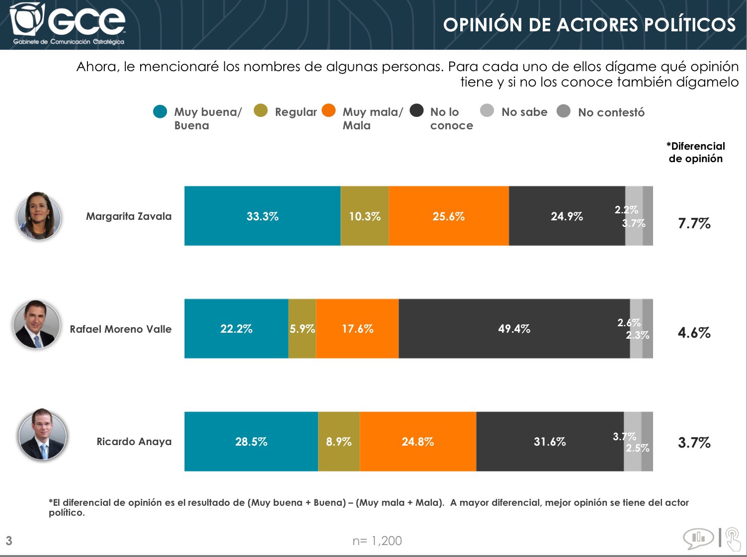 Alrededor de la mitad de los potenciales votantes, 49.4%, no tiene idea quién es Moreno Valle, 2.2% tienen buena opinión de él, 5.9% regular y 17.6% mala.