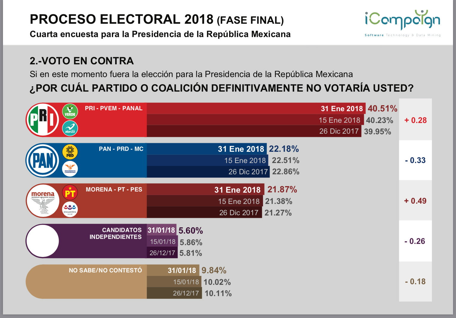 La alianza por la que la mayoría de los mexicanos “definitivamente no votaría” es la que encabeza el PRI con un 40.51% de rechazo, seguida por la que encabeza el PAN con 22.18 y en tercer lugar, muy cerca, la coalición de izquierda con 21.87%.