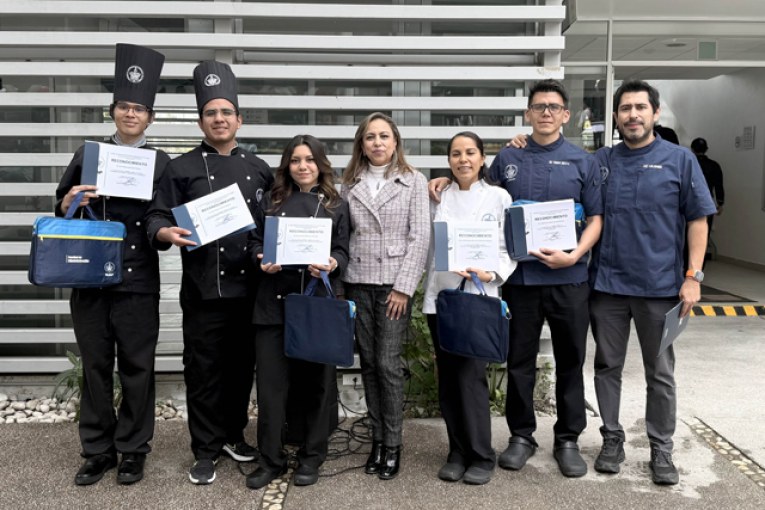 Acompañada de los estudiantes Ana Camila Álvarez del Río, Axel Omar Molina Reyes y Luis Edmundo Ruiz Ponce, quienes ganaron el primer lugar en este certamen gastronómico, la directora reconoció su talento y creatividad con platillos típicos del Día de Muertos, con los cuales superaron a competidores de otras escuelas de gastronomía.