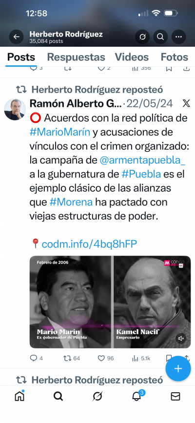 Por ejemplo, reposteó temas como que acuerdos de la red política Mario Marín y acusaciones de vínculos con el crimen organizado confirman que la campaña de Alejandro Armenta Mier, hoy gobernador, han pactado con las viejas estructuras de poder.