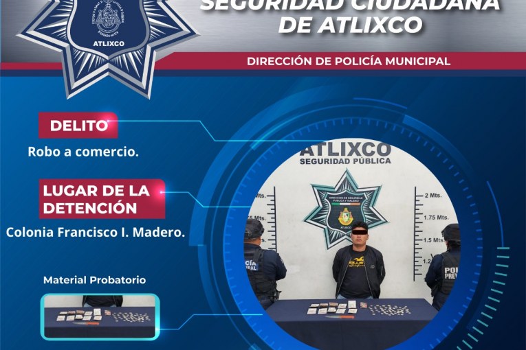 Elementos de la Policía de Atlixco detuvieron a un masculino por su probable responsabilidad en el delito de robo a comercio, tras un reporte ciudadano en la colonia Francisco I. Madero.