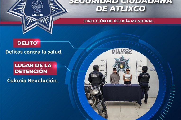 Como resultado de los recorridos permanentes de vigilancia y patrullaje preventivo, la Secretaría de Seguridad Ciudadana de Atlixco logró la detención de un hombre y una mujer en la colonia Revolución por su probable responsabilidad en delitos contra la salud, luego de que elementos municipales los detectaran realizando un presunto intercambio de una sustancia con características similares al narcótico conocido como cristal a cambio de dinero en efectivo; al percatarse de la presencia policial, ambas personas intentaron retirarse del lugar sin éxito.